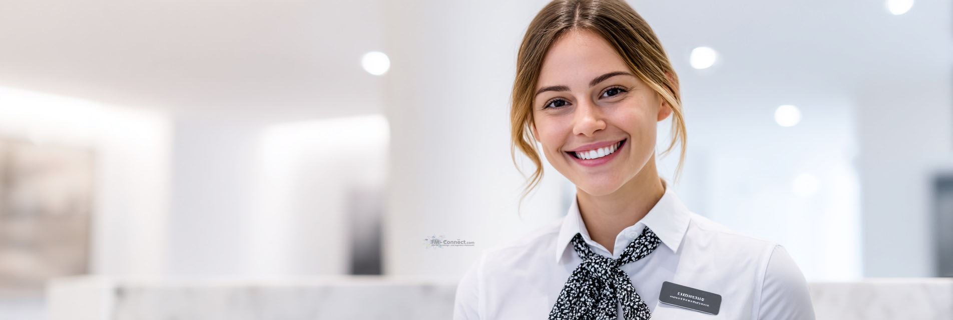 Empfangsmitarbeiter: Dunkler Anzug oder Kostüm (Blazer und passende Hose/Rock), weißes Hemd bzw. Bluse, dezente Krawatte oder Halstuch in den Corporate-Farben des Auftraggebers. Namensschild mit Name und Firmenlogo ist auf Brusthöhe angebracht.